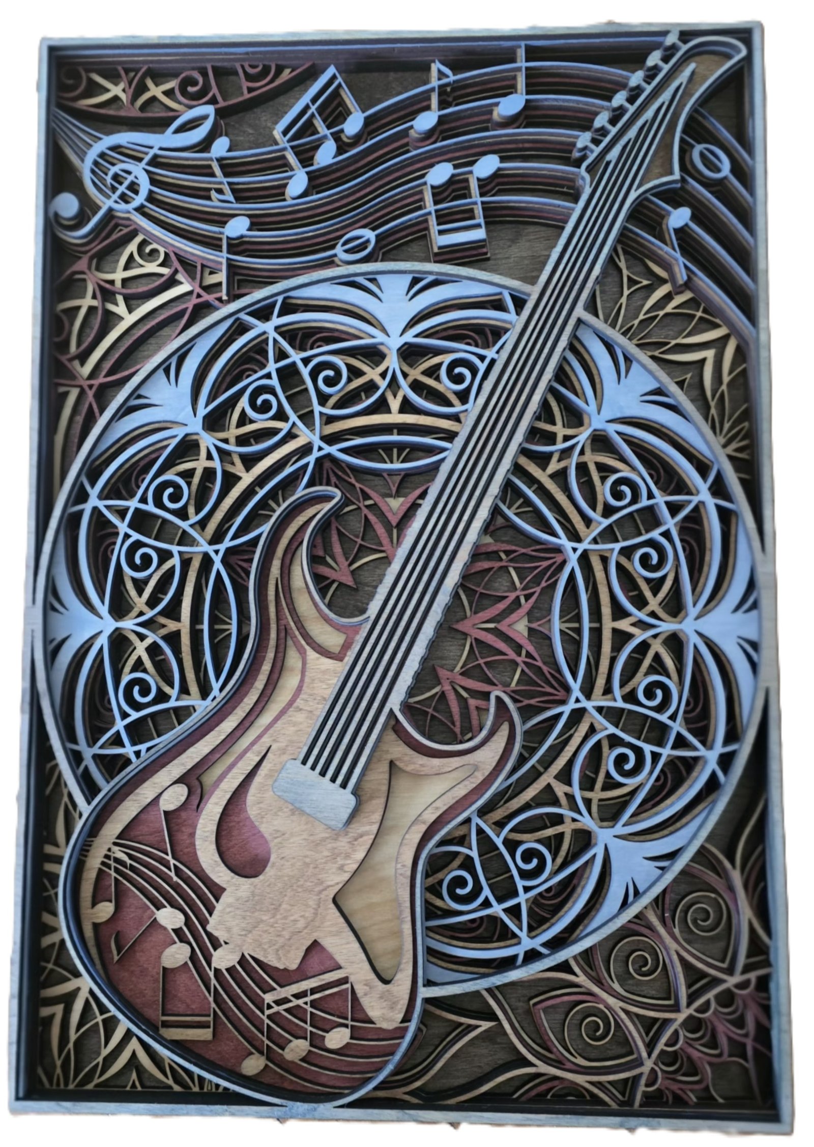 Attention MUSIC LOVERS – This is a “must have” statement piece for your home office, or music room. This uniquely crafted guitar features multilayered wood-cut details, artfully painted by hand to highlight the curves, texture, and rhythm it represents. Musical notes dance above the guitar, emphasizing the spirit of creativity and expression.