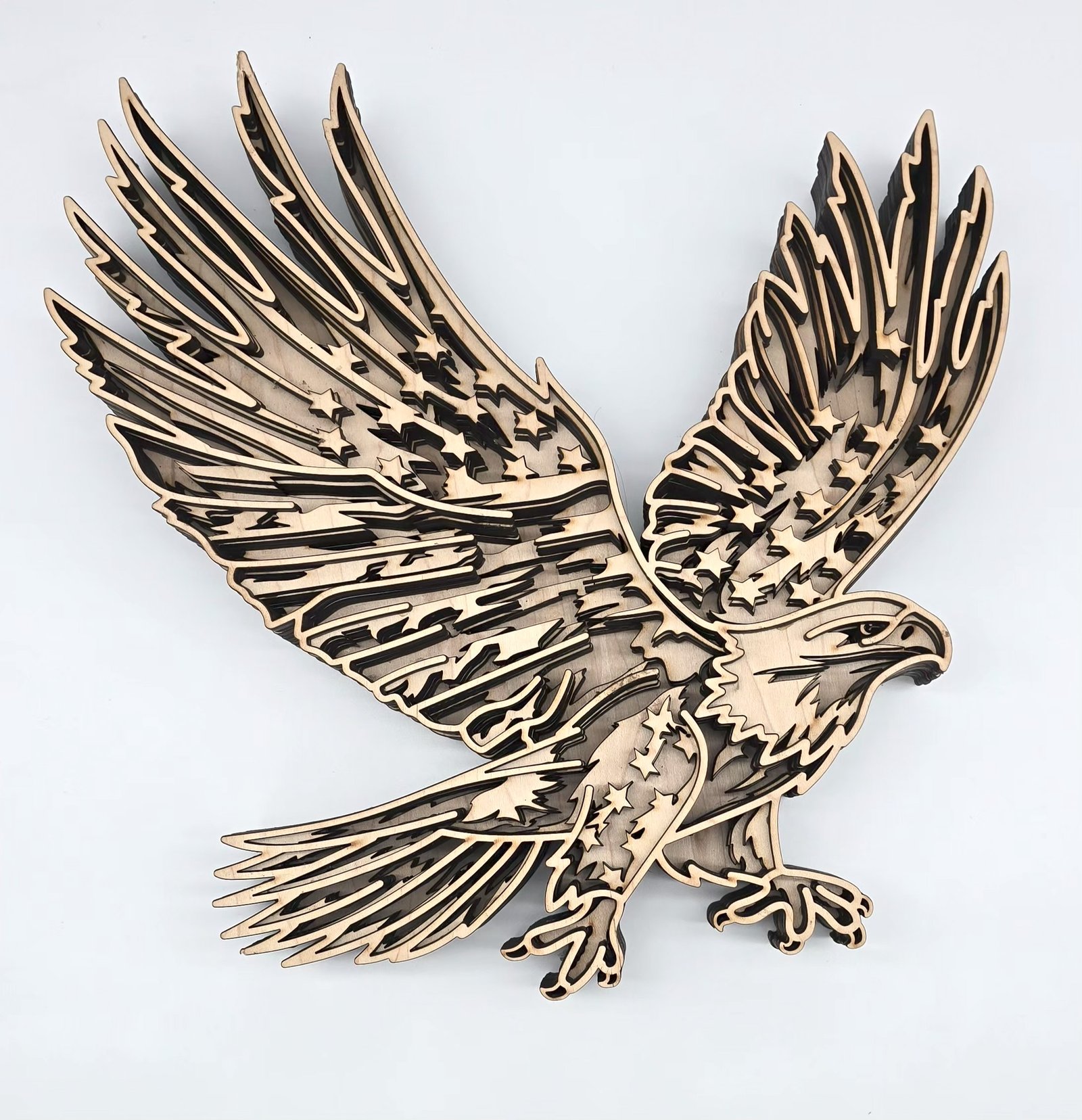 Majestic, detailed, and proudly patriotic-an eagle to treasure. Symbolizing freedom and pride, this multilayered wooden eagle is lasered with remarkable detail, capturing the elegance of our nation’s bird. A must have for anyone looking to enhance their patriotic home or office decor, it hangs easily with the included attachment. Available in two sizes, medium and large, due to the detail of this fine piece of art small is not recommended.
