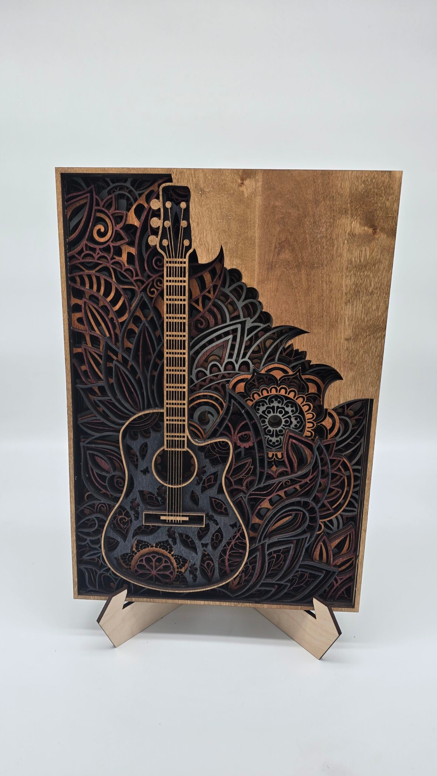 Attention GUITAR LOVERS – This must have signature piece will definitely make a statement in your home, office, or music room. This uniquely crafted guitar features multilayered wood cut details, artfully painted by hand to highlight the curves, textures, and rhythm it represents. This piece will bring out the guitar enthusiasm in your soul, emphasizing the spirit of creativity and expression.