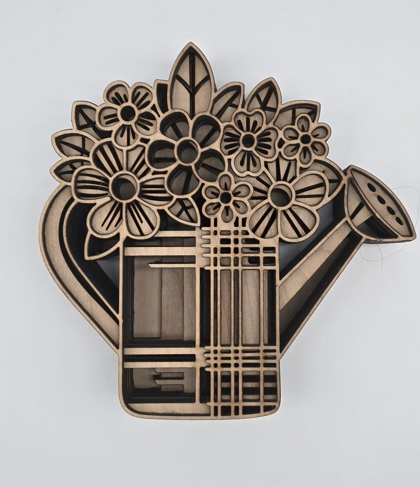Bring the essence of Spring into your home or office with this charming bouquet of flowers displayed in a watering can. Expertly crafted from multilayered laser-cut wood, it showcases vibrant detail and artistic depth. Includes a laser-cut stand, with an optional wall mount attachment upon request.